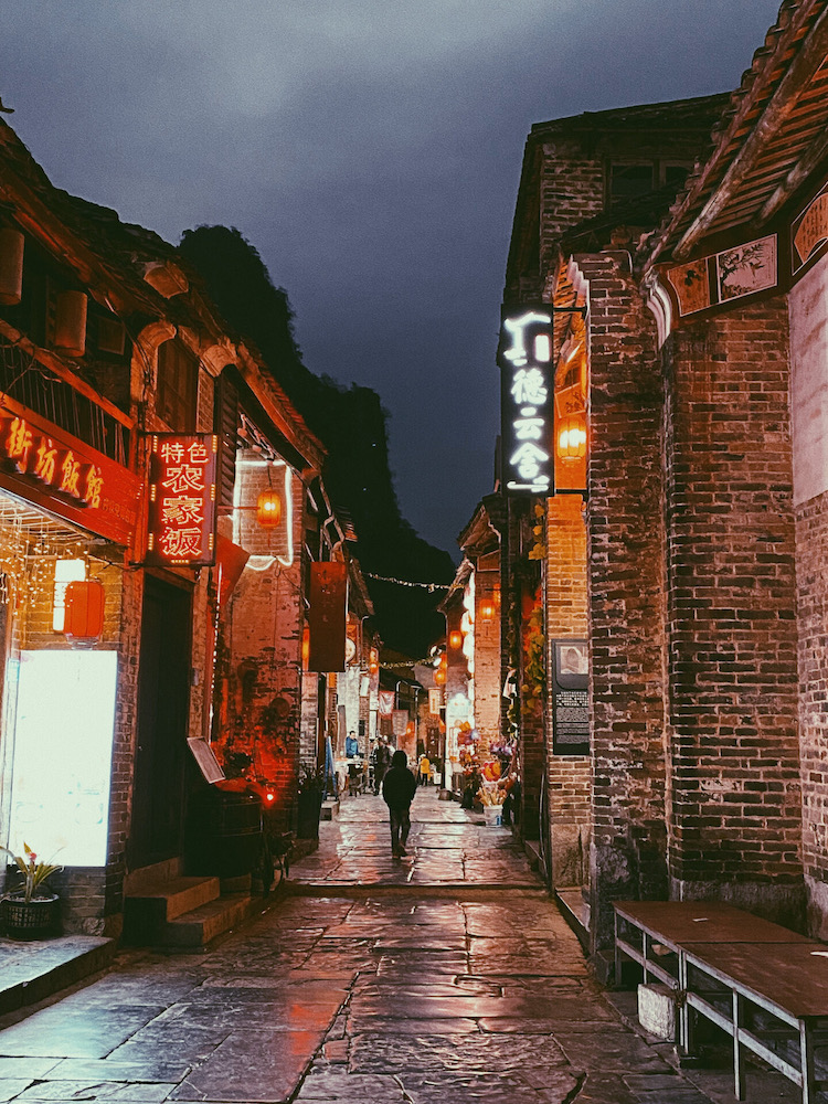漓江上一颗璀璨的明珠,位于阳朔县东北部。20元人民币的背景地就是在兴坪。具有1700多年历史,各类砖瓦结构的古建筑大部分保存完好,古街的东南侧狮子旦为熙平县城遗址,城墙轮廓尚清,随处可见古砖瓦陶瓷残片,只是原来车马来往人看人的繁华县城,呈现出一派青山幽幽、村舍几座的肃静氛围。