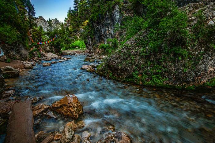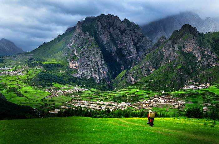沿着郎木寺走过草原,有一条明晃晃的小河,将两岸的建筑珍珠般串了起来,跨过源头再向里走,峭壁悬岩,危峰兀立,直冲云霄。这便是【纳摩大峡谷】,峡谷悠悠的白云在山峰之间飘游,沟中央裸石累累,两旁花草茂密,繁花似锦,花香醉人,流水时断时续,偶尔还有小动物从面前逃遁而去。入谷越深,越是静谧、幽邃,这里尚未被开发,走到尽头有一片开阔的草甸映入眼帘,牛羊慵懒地啃食着青草,恍若世外桃源。