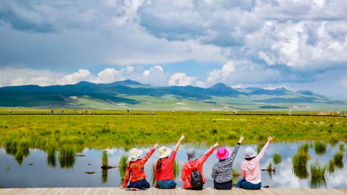 晨起用完早餐,驱车来到位于热尔大坝的草原湖泊【花湖】,花湖是因为从高处俯瞰下去蓝天、白云、水草浑然一体,形状像花而得名,阳光照在湖面上,反射出五颜六色的光彩,蓝天白云倒映其中,分外迷人。这里是中国最大最平坦的湿地草原,花湖四周数百亩水草地就是“高原湿地生物多样性自然保护区”,保护区以黑颈鹤为主,可以走上浮桥,陶醉在湖水和花草的美景之中,与水鸟嬉戏,寻找黑颈鹤的足迹。