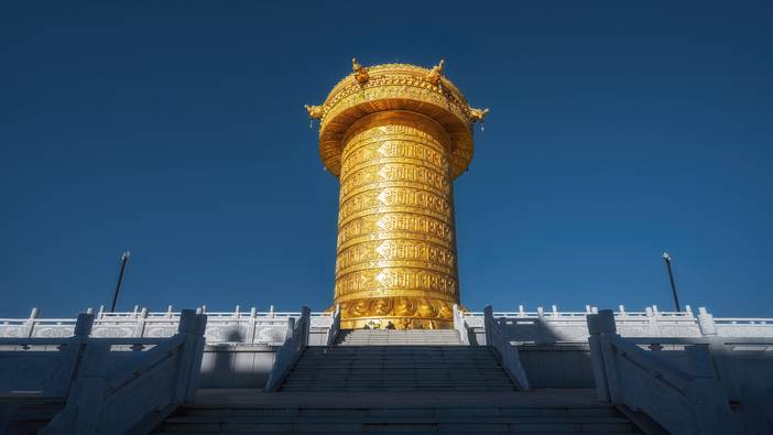 适时离开,前往【娘玛寺】,虽然娘玛寺的名气不如甘南州其他寺庙,但这里坐落着【世界最大转经筒】,该转经筒高达35.8米,下部直径12.43米,上部直径17.6米,重达320吨,创下世界吉尼斯记录!不光体积巨大,整个筒身用掉黄金100多斤,仅仅经书的重量就高达86吨,对于虔诚的藏族人来说,转经筒里装的经咒越多、转一圈的周长越长,那么转一圈积累的功德就越多。