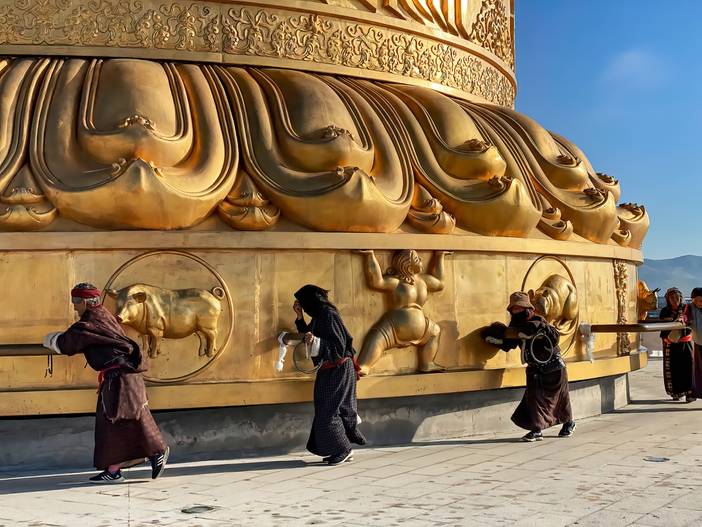 晨起出发,领略千沟万壑,沟壑纵横的黄土地貌。我们一路前往【米拉日巴佛阁】。佛阁是为了纪念最富传奇色彩、妇孺皆知的米拉日巴尊者而修建的,是供奉1720尊佛像的佛教名刹。楼高共九层,每一层都代表了藏传佛教的一个时代或支派,除藏传寺庙主佛外,这里还供奉着已经被神化的藏族历代名人,包括松赞干布和文成公主。米拉日巴佛阁融藏族堡式建筑和佛阁式建筑特色为一体。每一层皆有不同主题,第九层是坛城,画在第八层的天花板上,常人无法到达。坐在坛城下仰望,时刻警示着人类的局限而需保持谦逊,又鼓励着人们追求未知境界,纪录片《第三极》就曾记录这个场景。