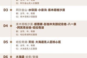 【行程概述】早餐后,继续深度游览【大海道无人区】,之后队员们可以选择在哈密结束无人区穿越行程,如队员选择在哈密提前结束行程,本日哈密产生餐费和住宿费用需自理,队员也可以选择跟车回敦煌,晚上我们在敦煌为大家安排了庆功晚宴。