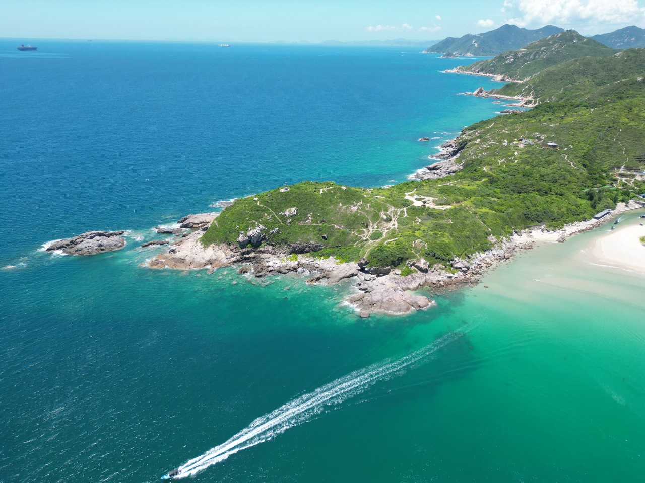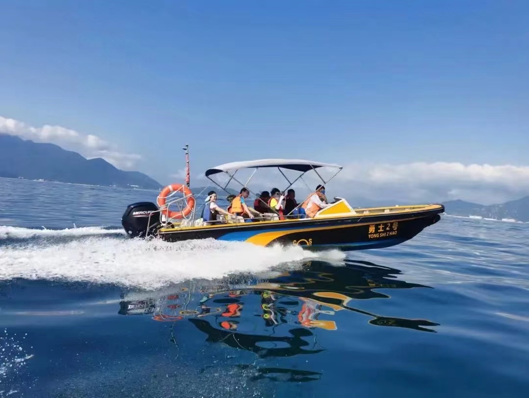 12:30 出发前往东涌海滩,乘快艇飞奔三门岛。沿途欣赏海岛风光,体验海面飞驰电掣的刺激。20分钟航程后登岛北扣码头。