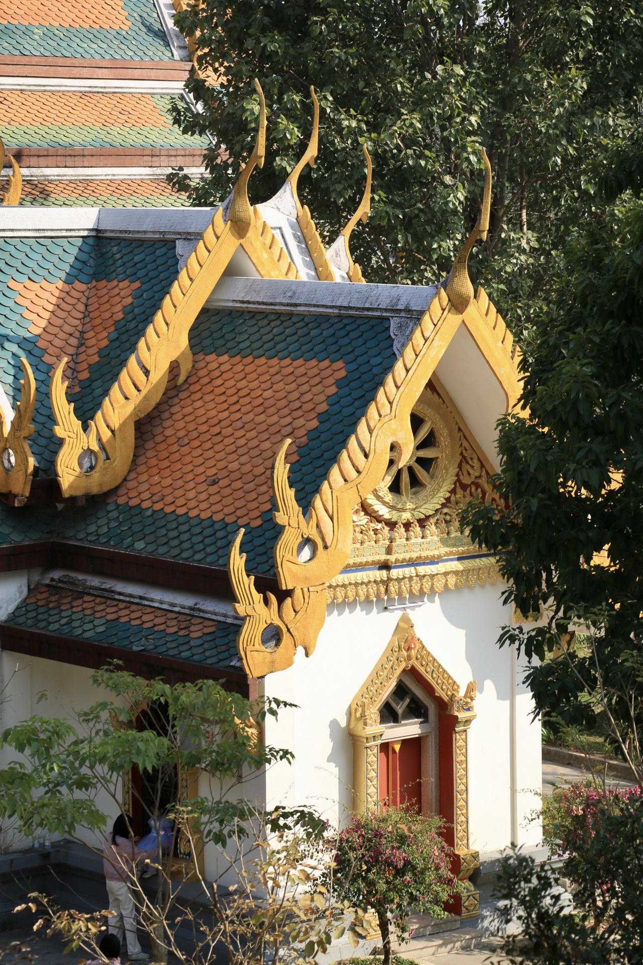 泰佛殿是中泰文化交流的典范,集中了泰国古代雄奇、精巧的建筑风格。重檐多面式屋顶装鱼鳞瓦、封檐板装向上的黄色图形,柱头、山墙、窗户等等巧思设计,无不让人惊叹。