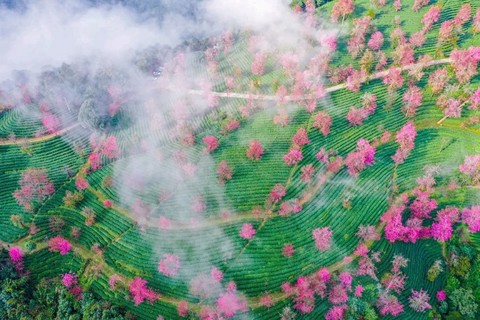 今天要早起,欣赏拍摄【无量山樱花谷】,走进樱花遍野的无量山茶园,缨花衬着绿茶,星星点点连成片,在阳光的照耀下更加迷眼。樱花散布在低矮的茶丛中,绿的墨绿,红的淡粉,一高一低,层次分明。