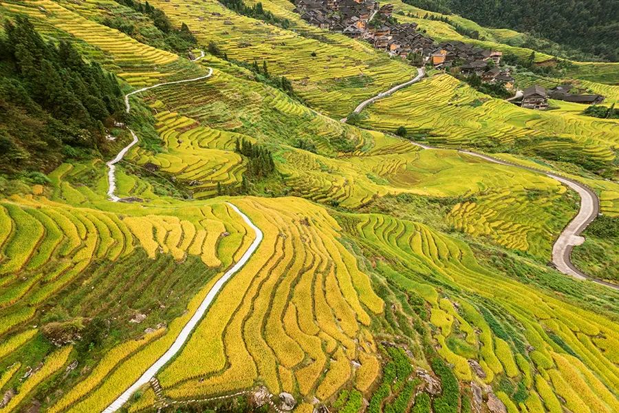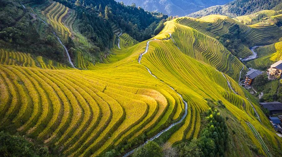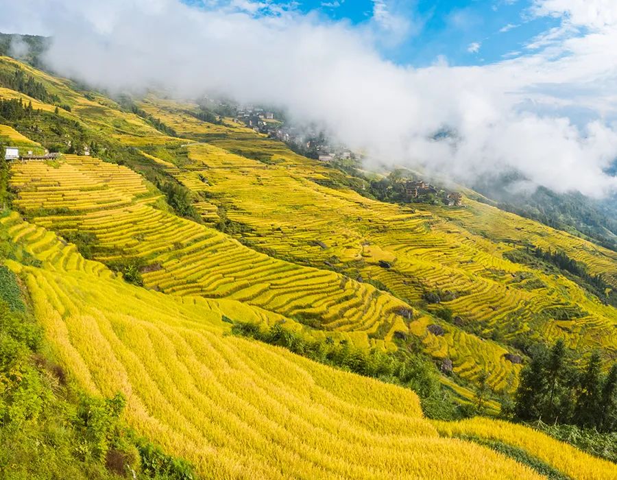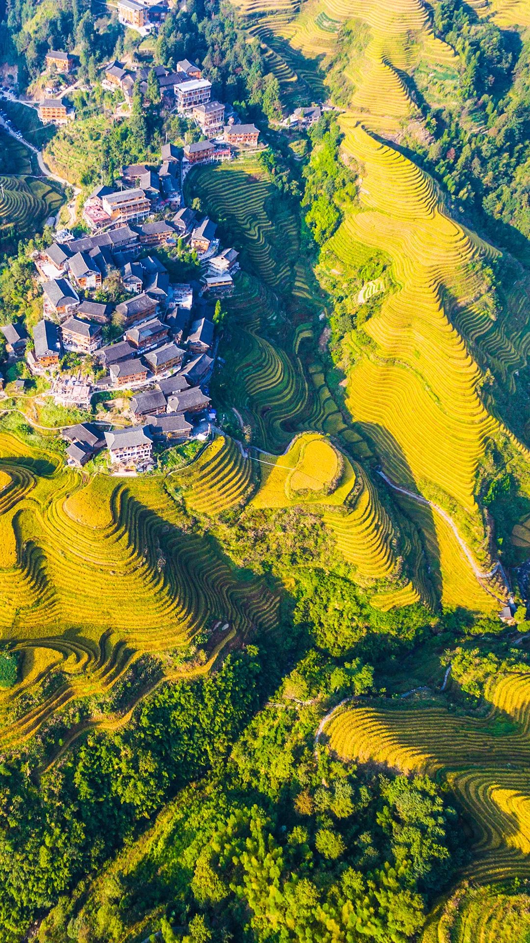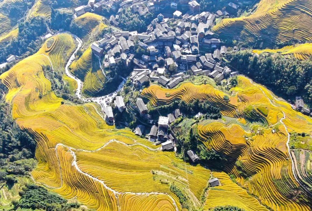 古壮寨的梯田9月中旬已成熟,最早进入金黄色的梯田