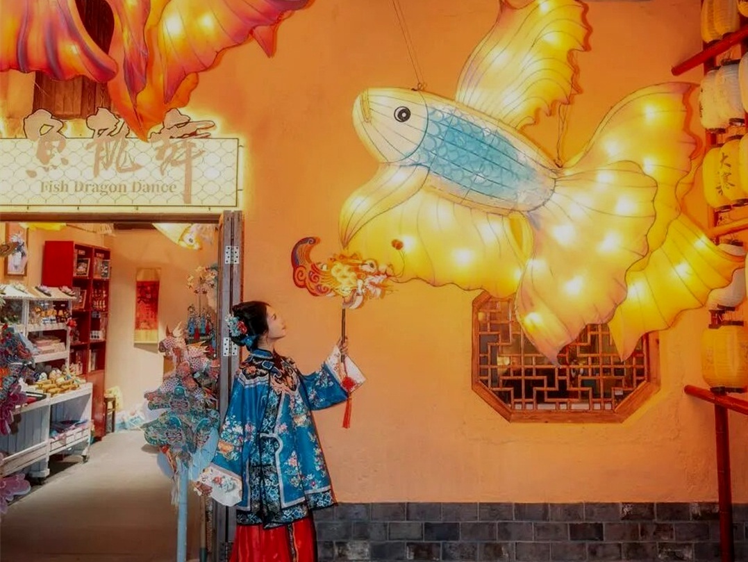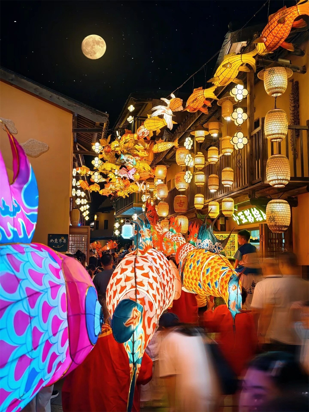 非遗鱼灯巡游:夜幕降临,百人手举鱼灯,跟随领头大鱼的轨迹,游走在街头巷间,漫城繁星,璀璨夺目