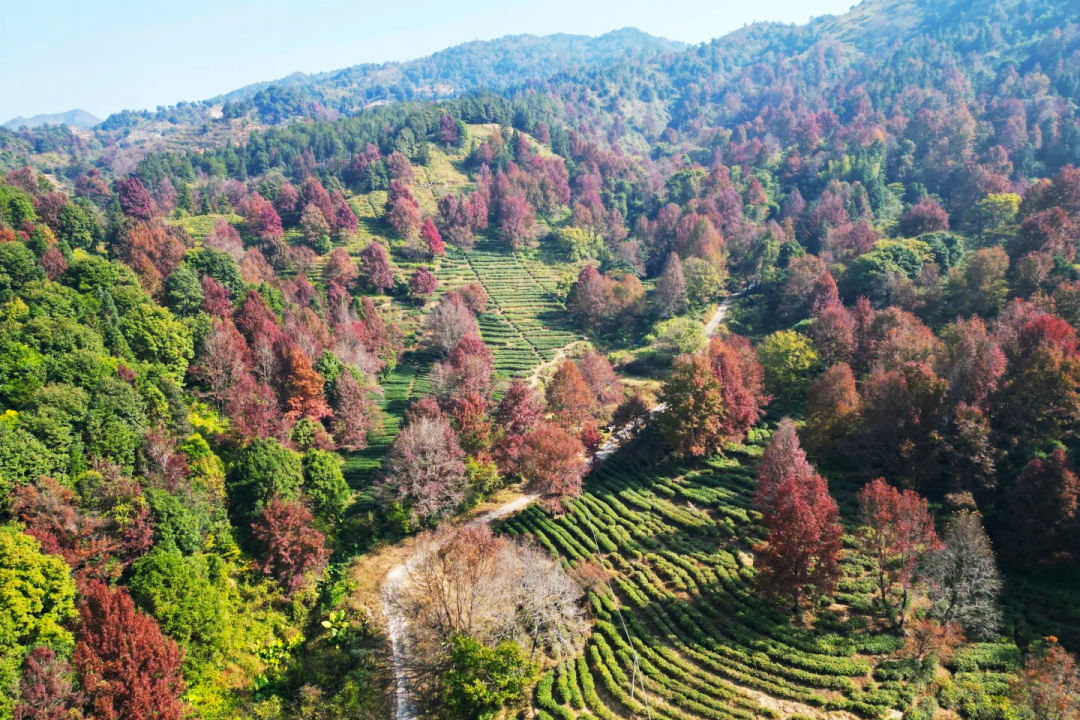 广东“无量山”:上百株枫树点缀在半山茶园之间,漫山层林尽染,枫情熠熠,抓一抓秋天的尾巴