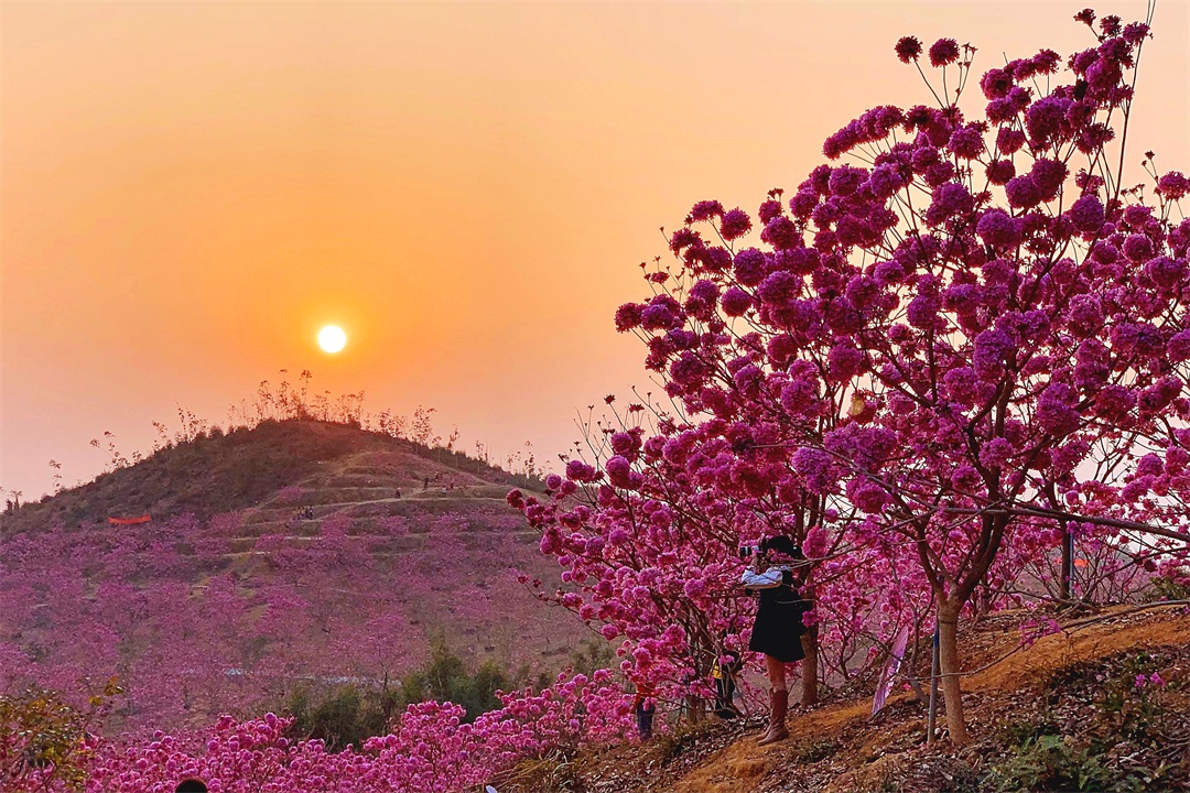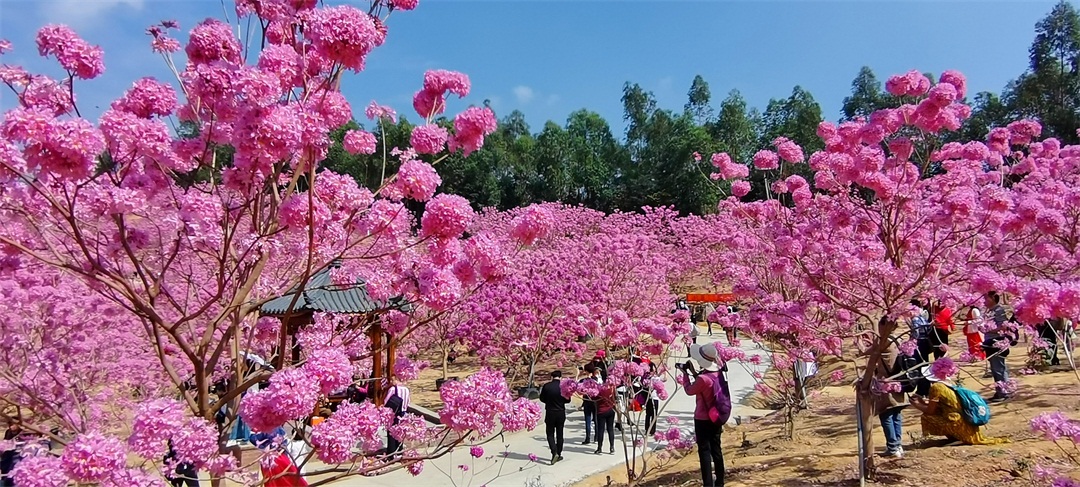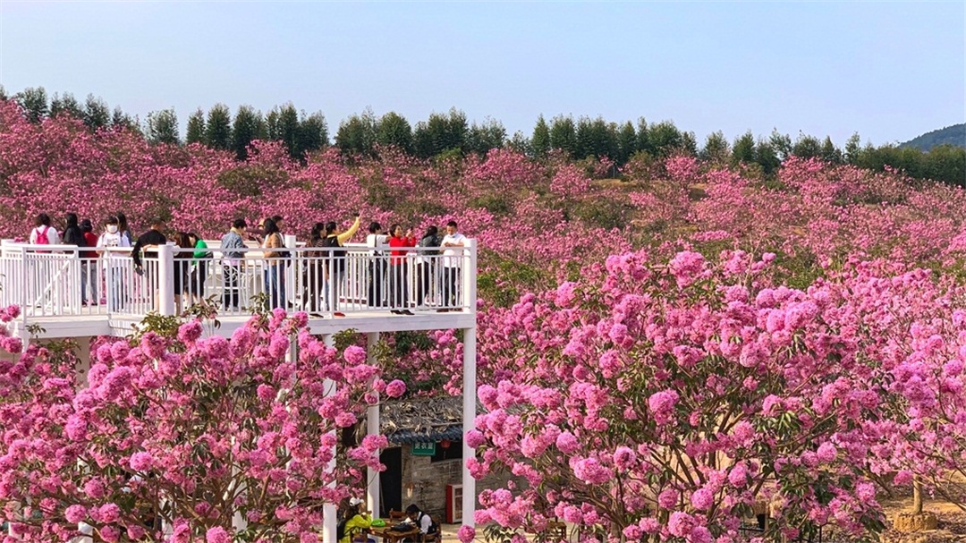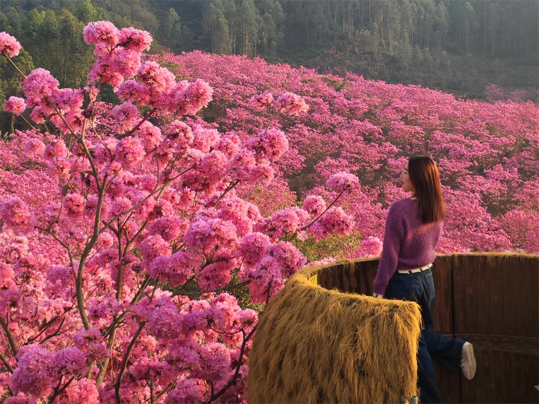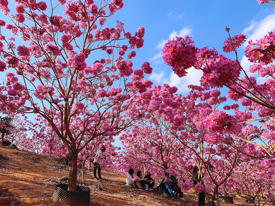14:50 到达【绿美生态园】,占地千余亩的紫花风铃木林场,每逢冬季,这里的风铃花争相怒放,浪漫花海开满山头,形成一片姹紫嫣红的海洋