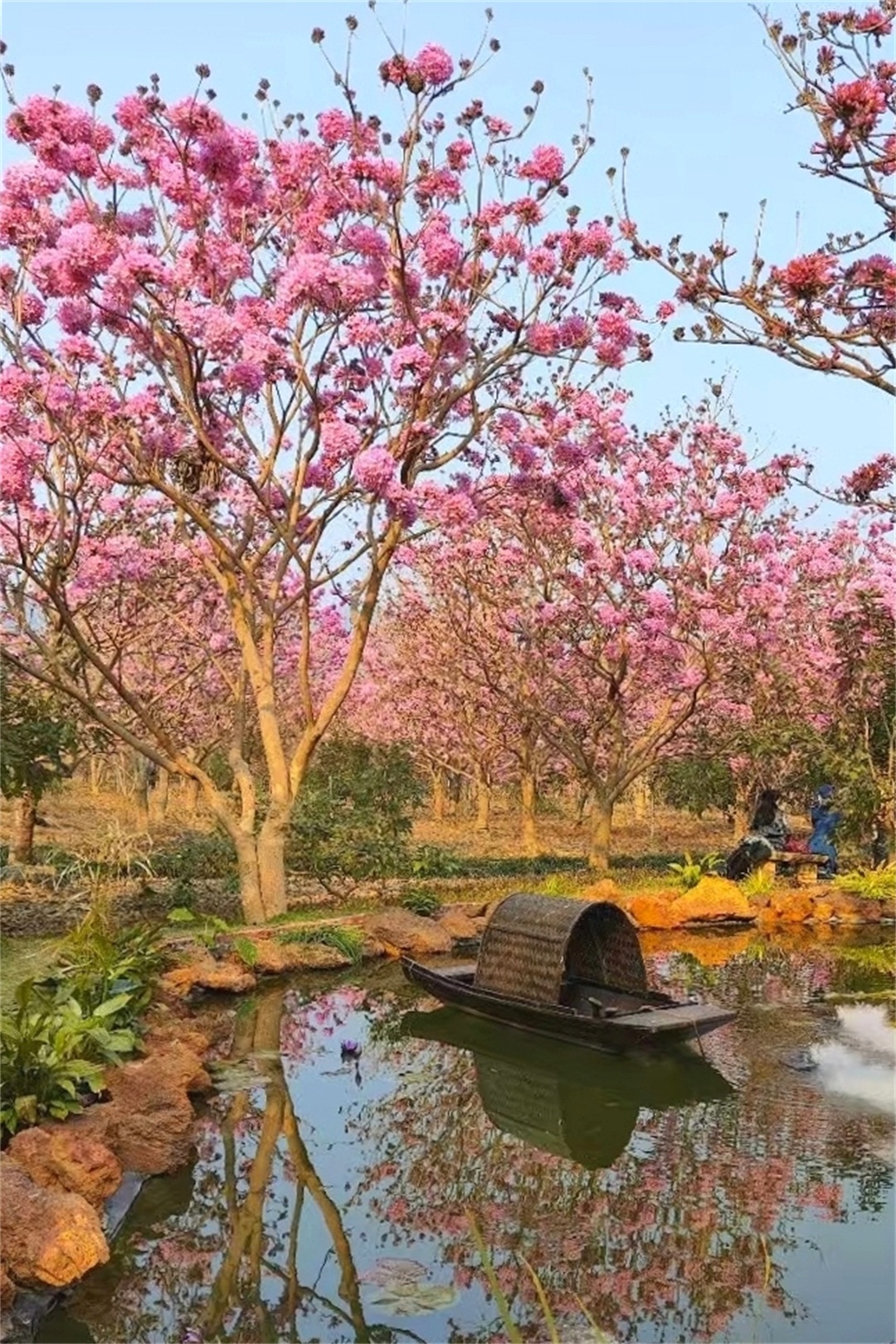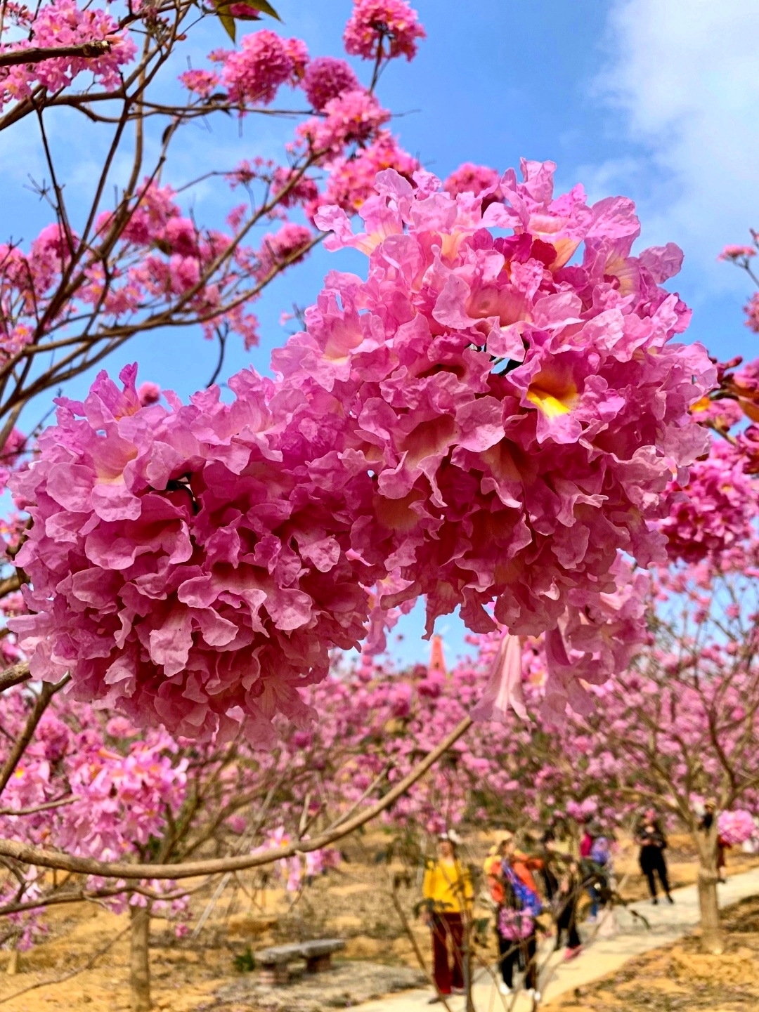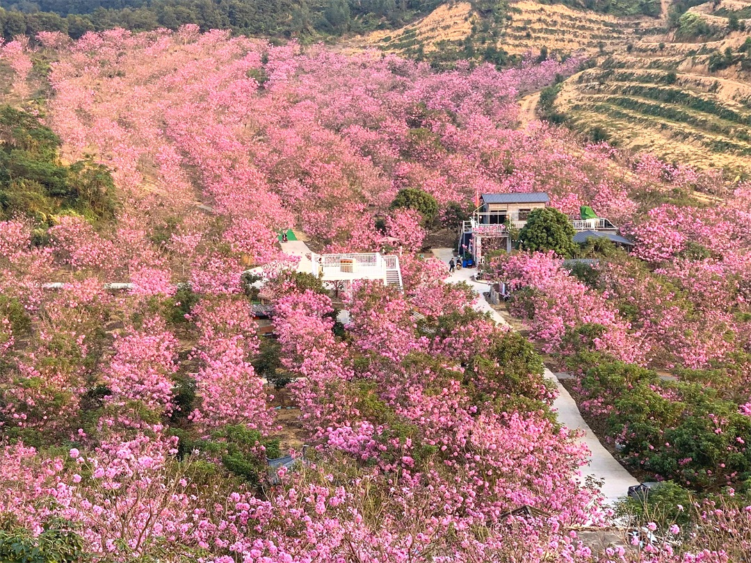 14:50 到达【绿美生态园】,占地千余亩的紫花风铃木林场,每逢冬季,这里的风铃花争相怒放,浪漫花海开满山头,形成一片姹紫嫣红的海洋
