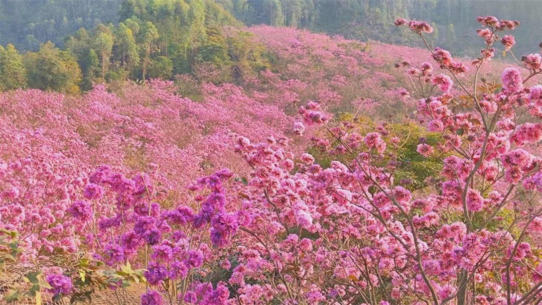 美拍千亩紫花风铃木,浪漫花海开满山头,只愿漫步在这片粉紫色的海洋