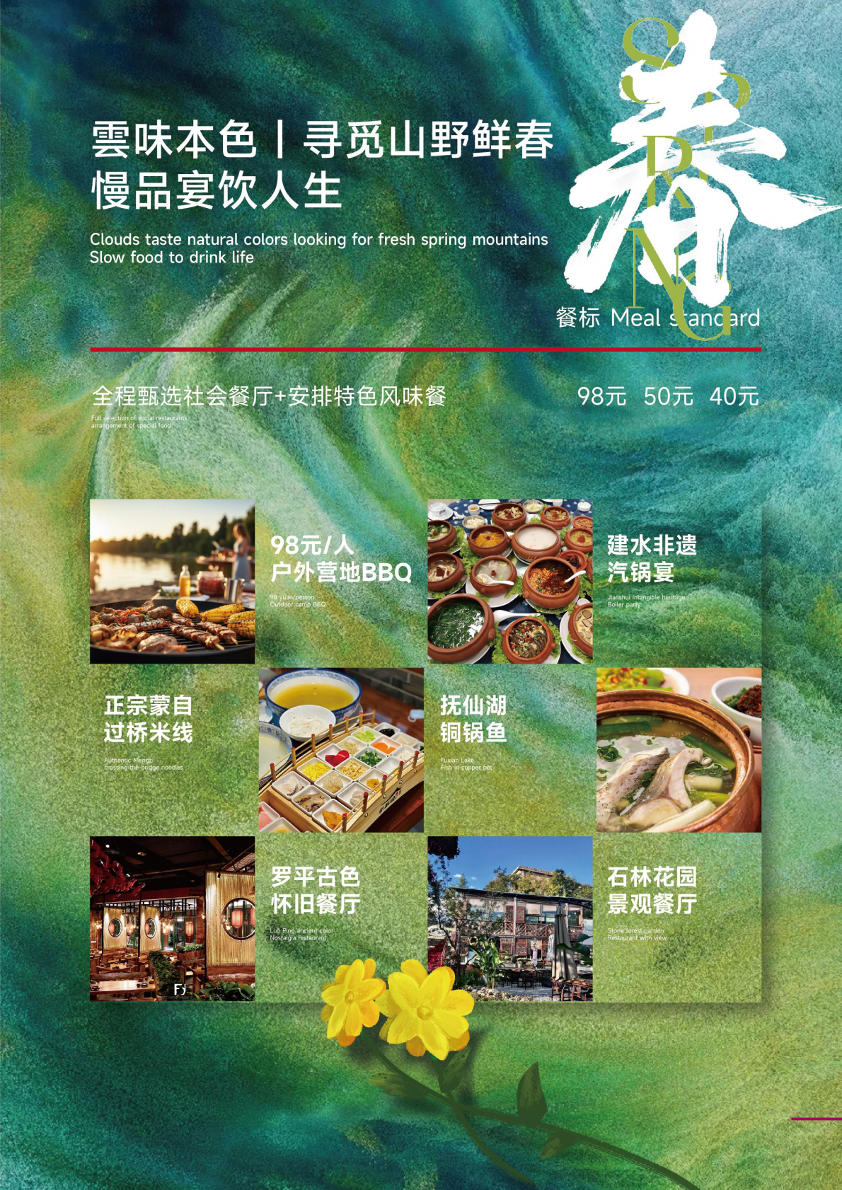 餐饮:酒店含早,正餐十菜一汤、十人/桌,共5早6正;餐标:40元/人,(特色餐建水非遗汽锅宴;正宗蒙自过桥米线;抚仙湖铜锅鱼。精选社会餐厅罗平古色怀旧餐厅;石林花园景观餐厅)、升级一餐98元/人户外定制野营BBQ。