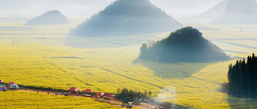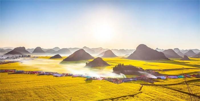 早餐后,游赏【金鸡峰丛•万亩油菜花田•观景栈道•炸头山观景平台】观赏日出的油菜花田,(内部电瓶车/小火车等根据个人需求自理),这是云南最大&中国最美的油菜花基地 ,电视剧《庆余年》等多部影视剧拍摄取景地 ,罗平被誉为"金玉满堂 "之乡 ,这里有数不胜数的锥状的小山丛,错落有致地排列在坝子里,满山遍野的油菜花扑面而来,无不令人醉心。