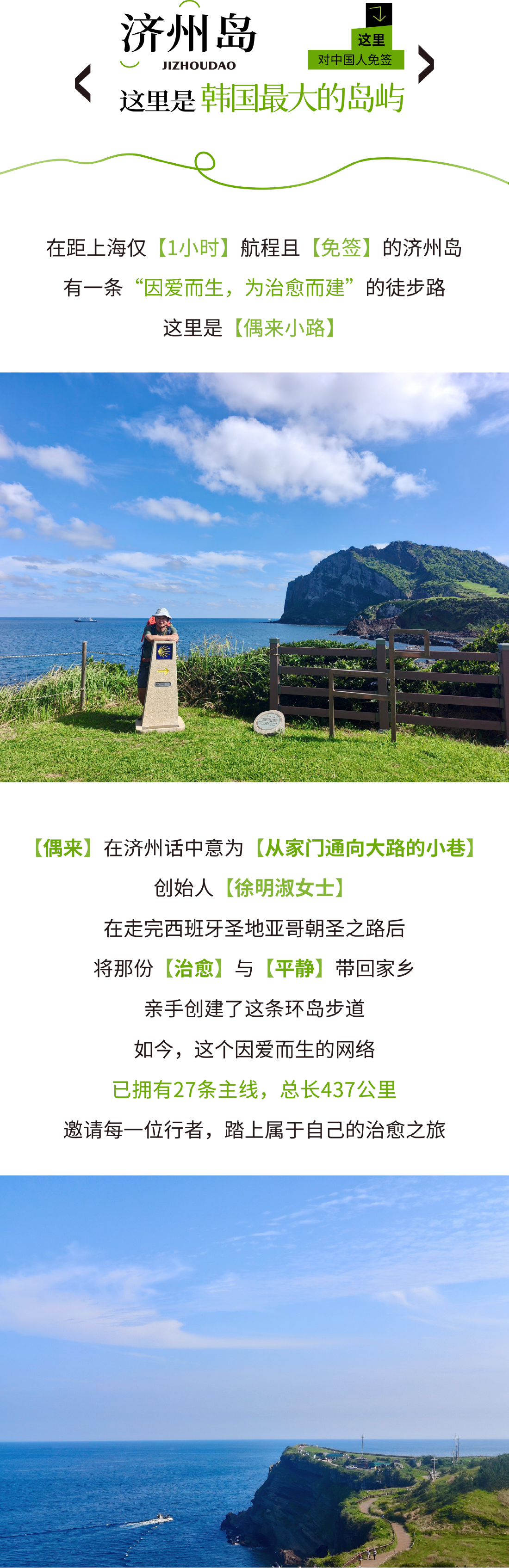 早餐后坐车前往1号线起点,这也是济州偶来最先开始的路线。,真正意义上的起点。经过绿油油的田野,登上末尾岳、卵岳,,看到城山日出峰、牛岛、一眼望去犹如展开画布的的原野和大海。 黑色石墙围绕的田地星罗棋布地连在一起的田野,就像用五连六色的布缝好拼贴上的一张方格布一样的美丽。
