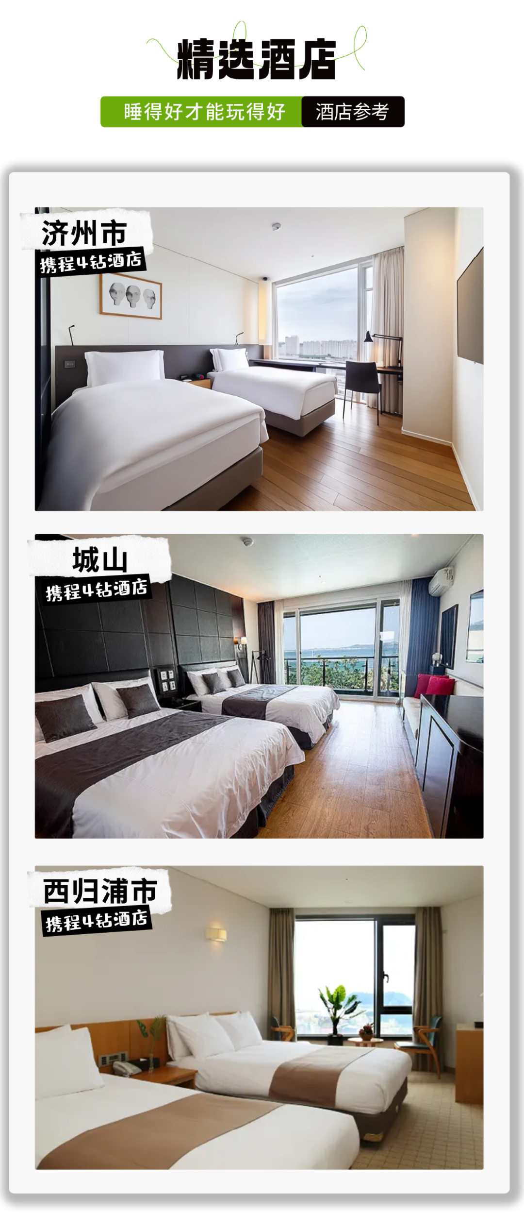 2、【住宿】一晚济州市四钻酒店、两晚城山四钻酒店、两晚西归浦四钻酒店;