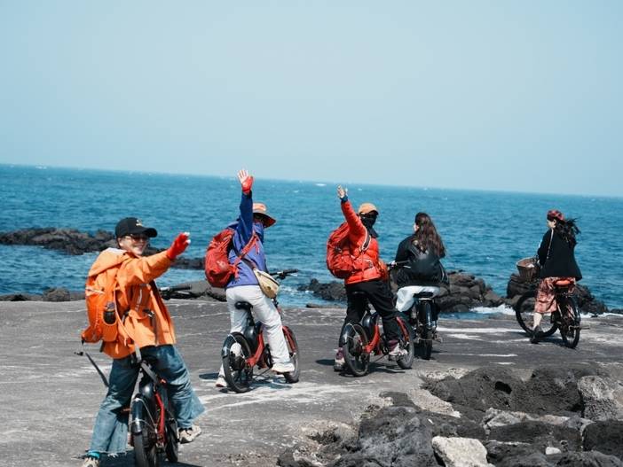 到达城山港,我们切换模式,上船前往牛岛。上岛后,我们将用车轮来丈量1-1号线,自行车环岛骑行(骑行时间2个多小时就能环岛一圈),济州岛的自行车都是带助力的,所以骑起来非常轻松,一路走走停停。