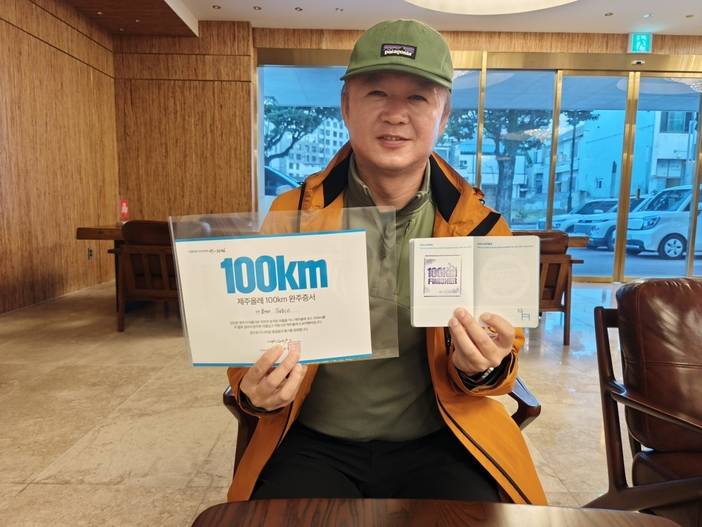 早餐后退房,将行李统一寄存前台。从酒店出发,今天我们将完成100km。到达孤根山脚下,我们沿着步道而上,没多久到达山顶,蓝色小马就在我们面前,盖完章下山,路过翁渡瀑布,来到西归浦客运站,这里是7号线的终点和7-1的起点。