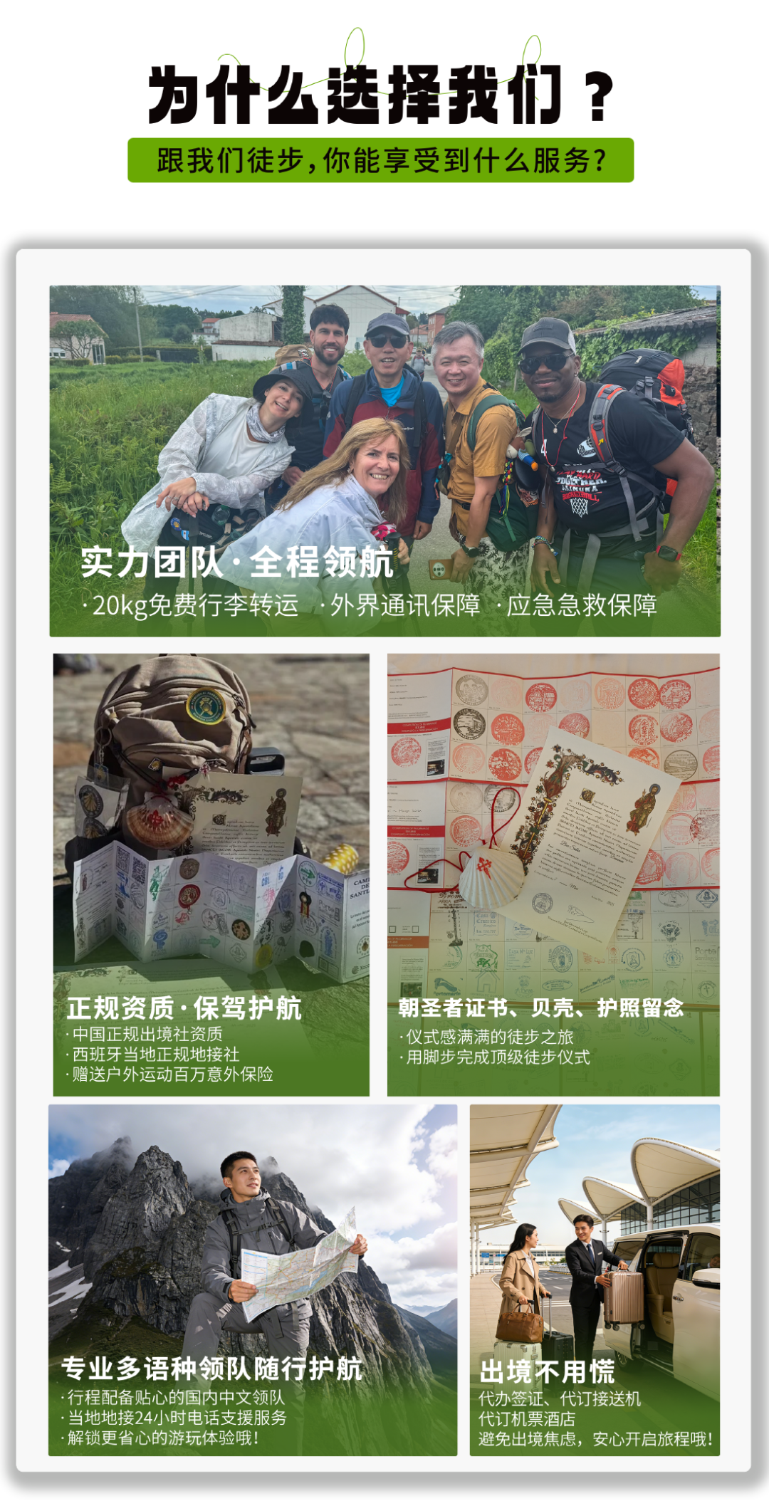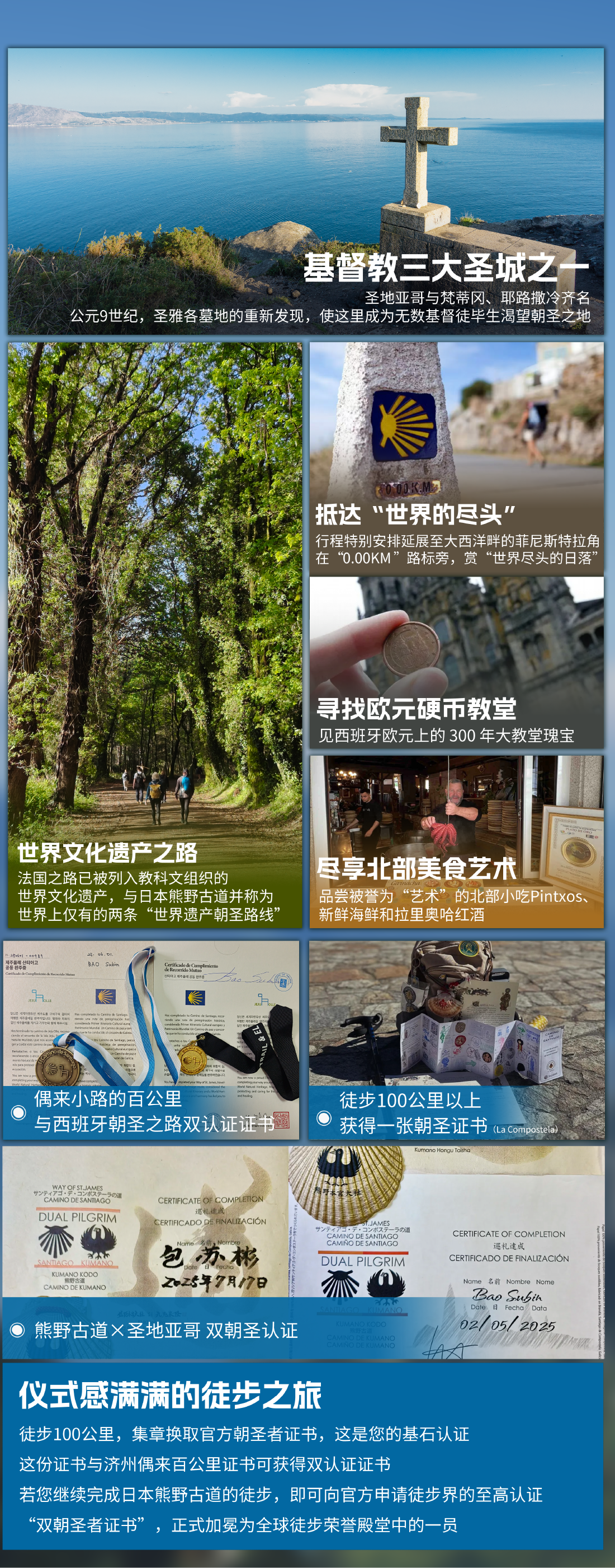如有队员已经走过日本熊野古道,想走完圣地亚哥朝圣之路后申请圣地亚哥官方颁发的双朝圣者证书,请在出行前务必携带熊野古道的盖章册子原件(即朝圣者护照,证书不需要携带)。请在徒步抵达圣地亚哥前将该需求告知领队。