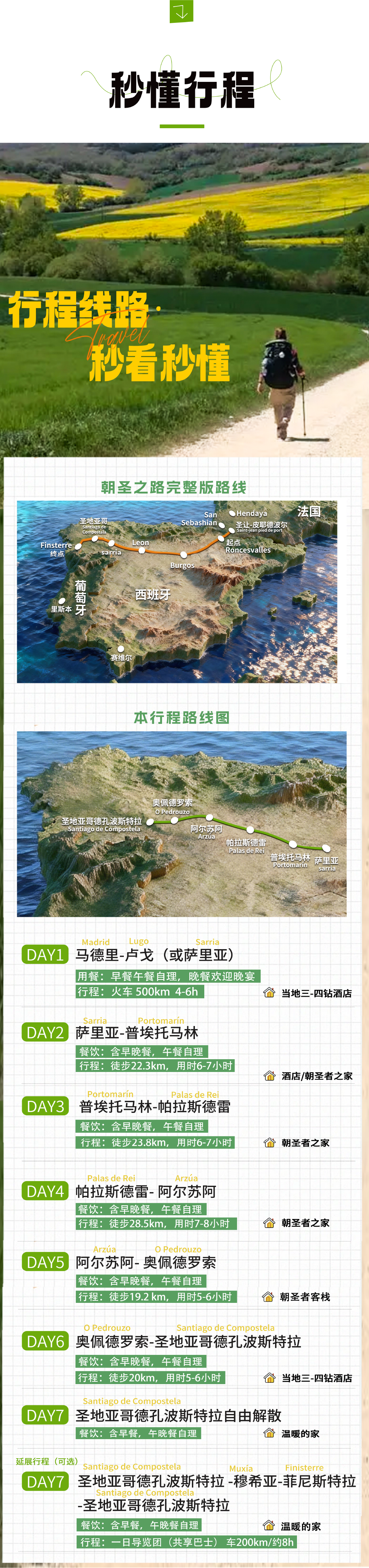 2、最终每日徒步路线公里数和住宿酒店/或朝圣者之家会根据实际预定时的情况而微调整。