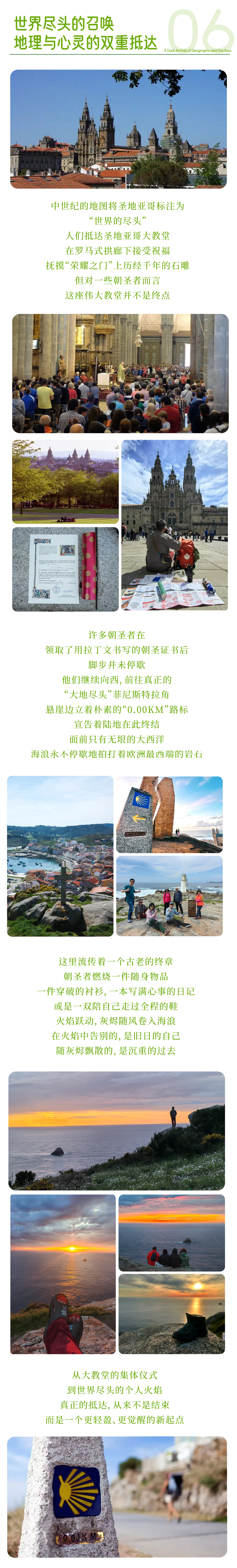 行程首先前往宁静而纯净的穆希亚小镇,迎着大西洋的海风,沿海岬漫步,欣赏 “最近大西洋教堂” 所在的壮丽海岸景观,感受信仰与自然交汇的力量。随后继续前行,抵达被视为 “世界尽头” 的菲尼斯特拉——朝圣之路 0.0 KM 的终点之地。