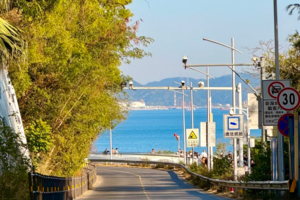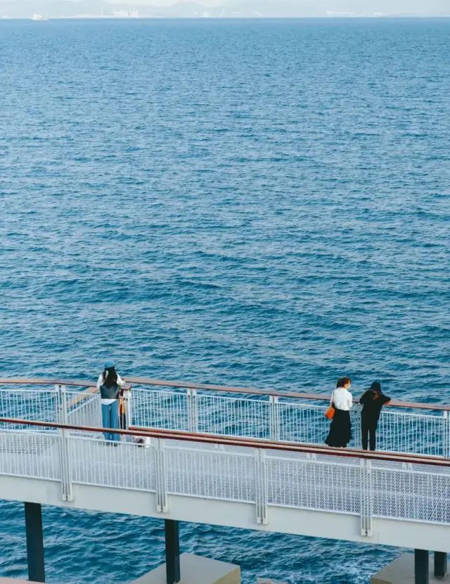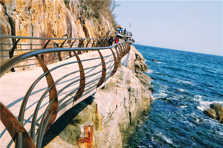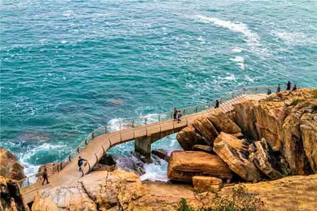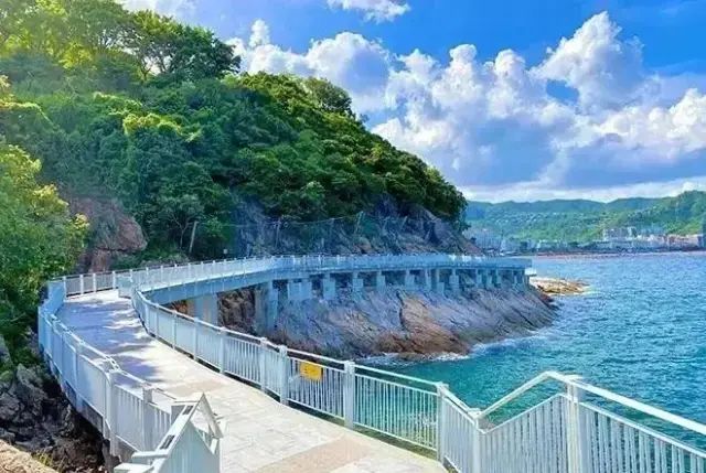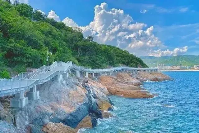走在栈桥上,一望无际的海面波澜壮阔。栈道弯弯曲曲,蓝天白云,海蓝浪花,构成一幅美丽的景色。栈道漫步、骑行,面向大海,听惊涛拍岸,栈道旁边绿树成荫,海风拂面。