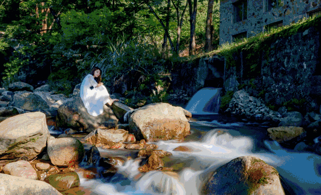 枫叶、青山、瀑布、溪流