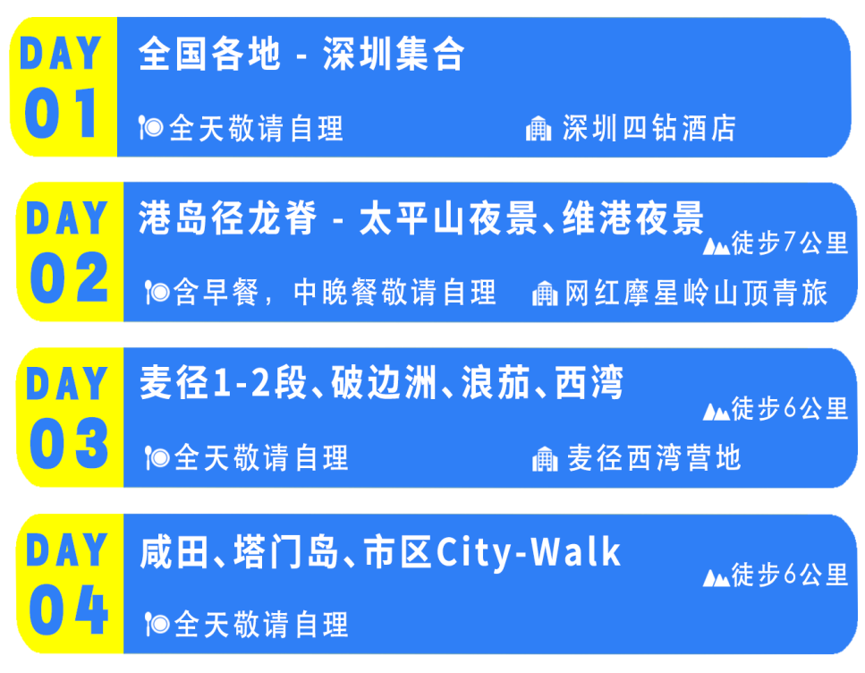 注:因香港住宿比较紧缺,如青旅满房会安排香港其它香港市区酒店住宿,如需了解当期住宿可咨询客服,住宿都是精品优选。