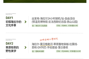 海拉尔-莫日格勒河(河畔远眺小憩时光)(40KM,车程约0.5小时)-穿越草原腹地-拉莫线-恩和(225KM,车程约3小时)-DIY列巴-手绘套娃-落日香槟