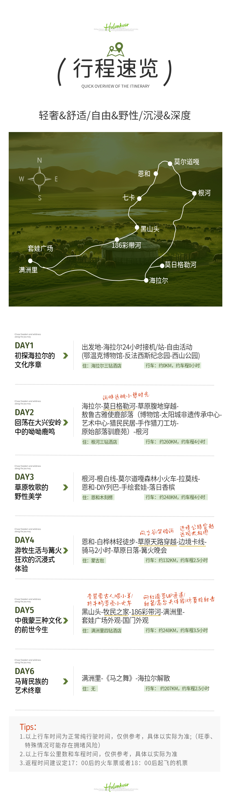 海拉尔-莫日格勒河(河畔远眺小憩时光)(40KM,车程约0.5小时)-穿越草原腹地-敖鲁古雅使鹿部落(230KM,车程约3.5小时)-根河