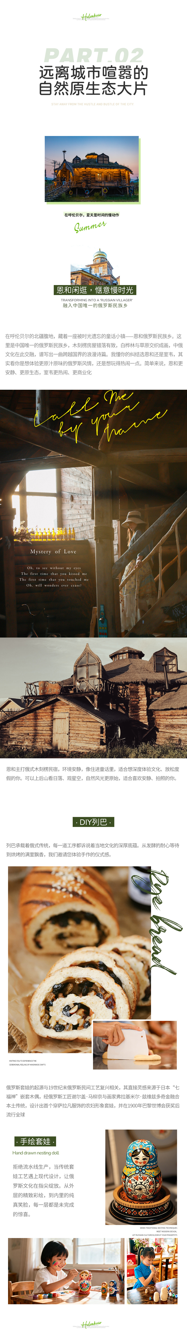 17:30 抵达【恩和】入住,随后亲手体验列巴制作,高温烘焙之后,外皮硬脆,內里松软,品尝正宗俄式风味。亲手制作俄罗斯套娃,绘制底稿,从面部开始上色,以鲜亮色彩勾勒出形象,再层层嵌套。小小套娃,承载精湛工艺,每打开一层都是惊喜,尽显浓郁异域风情。