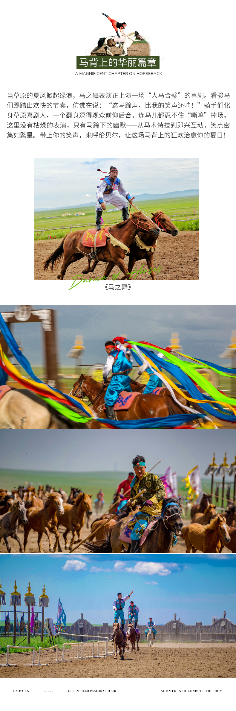 10:00 抵达巴尔虎,体验最具蒙古魅力的【马之舞】。因为蒙古民族是草原民族,马则是他们最亲密的朋友,又是长途跋涉的工具。草原为根、马者为魂,人马合一,以蒙古马术表演为主,有训练有素的专业蒙古马术团队年轻的男女携百骑马匹做马上表演。是综合性的马术表演,又是以天然的呼伦贝尔大草原为背景,在表演时,不时传来阵阵掌声和喝彩声,震撼、壮观、彰显了蒙古民族特色,让人赞不绝口。